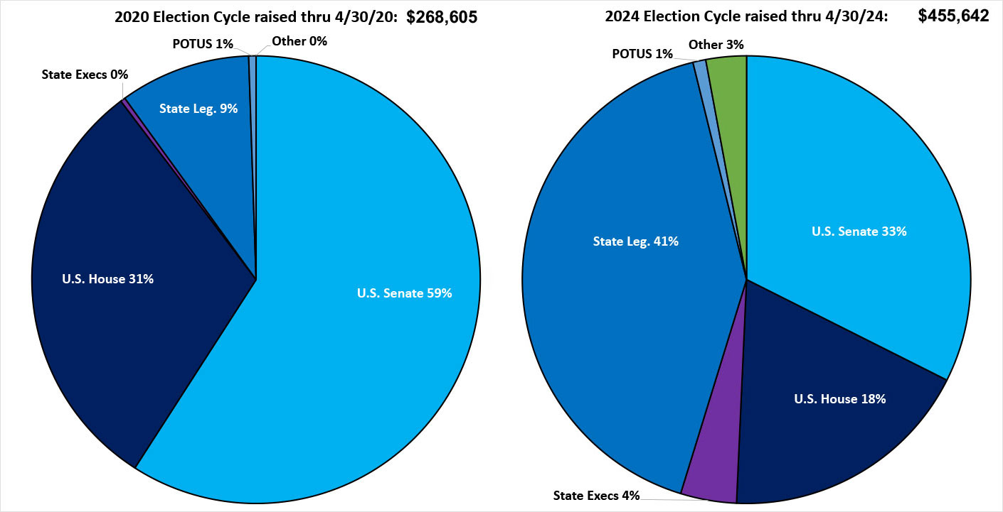 The most dramatic difference is the huge increase in state legislative race donations--over 7.4x as much so far vs the same point last cycle!