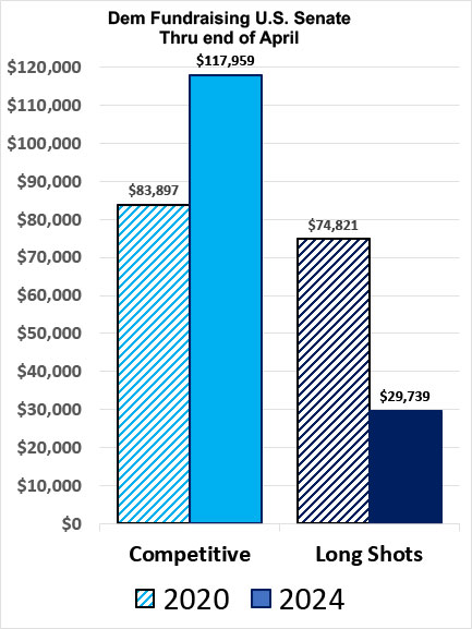 Finally, fundraising for U.S. Senate races has nearly caught up with 2020; it's now only 7% behind the same point four years ago.