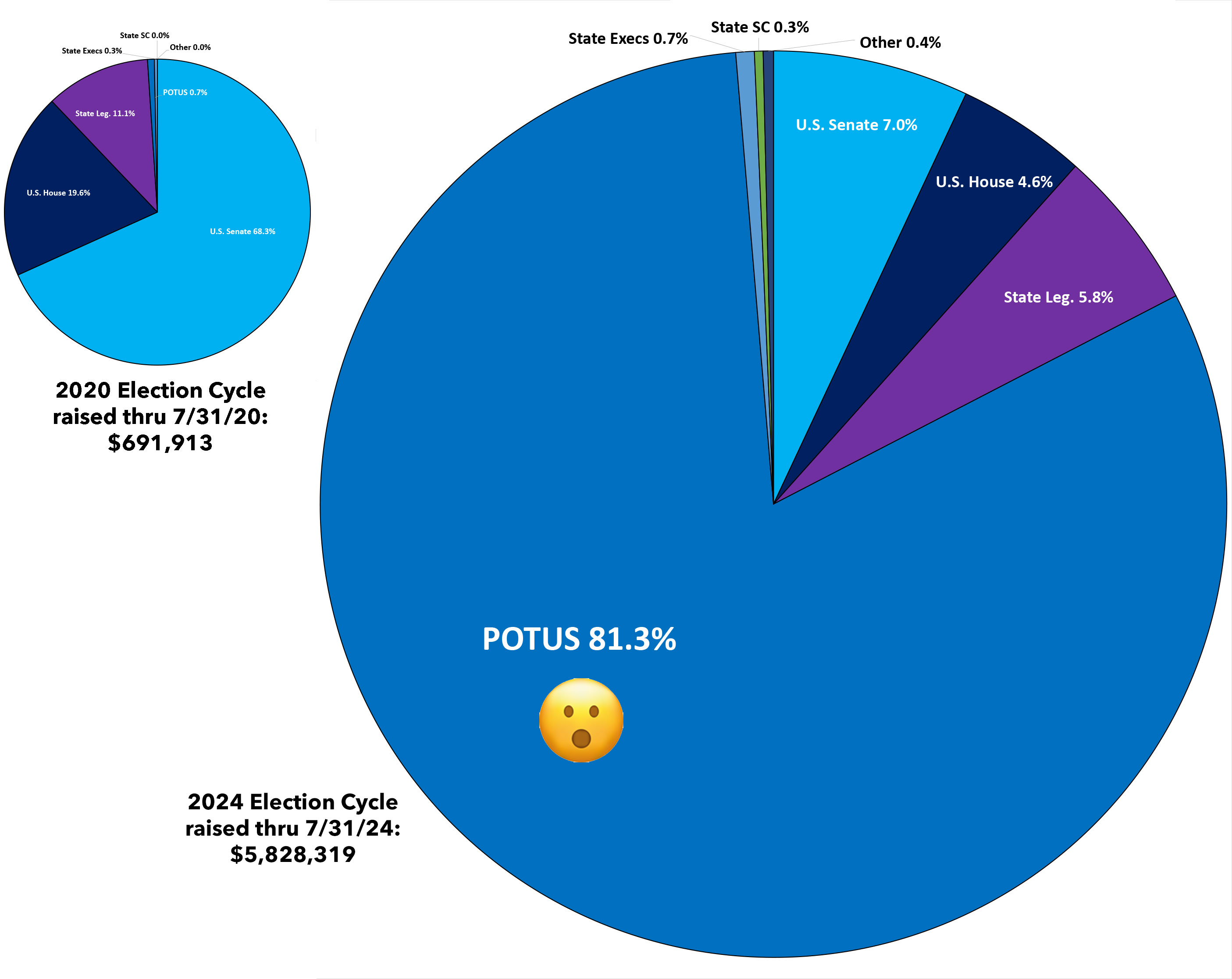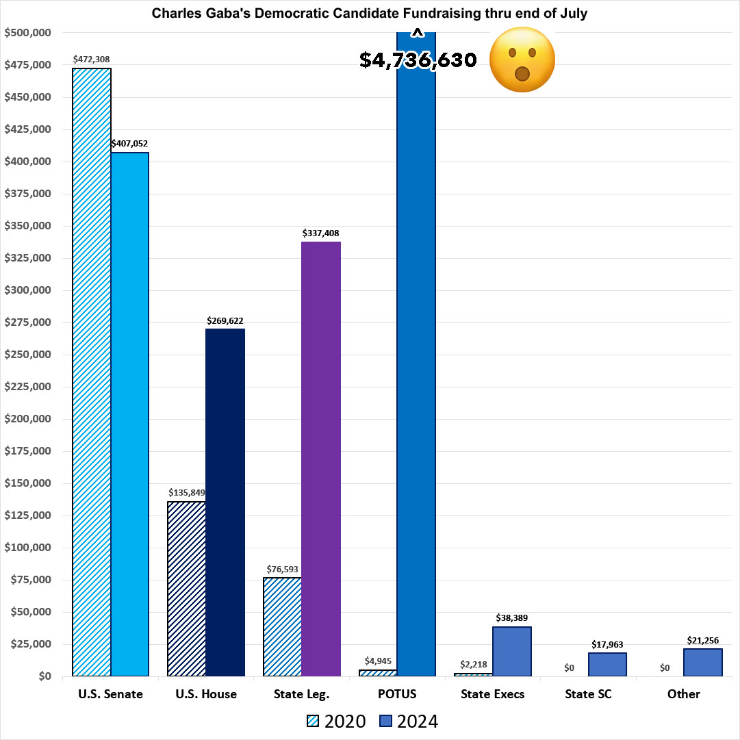 Four years ago, at the end of July 2020, I had raised a total of $692,000 for Democrats up & down the ballot, broken out as follows;