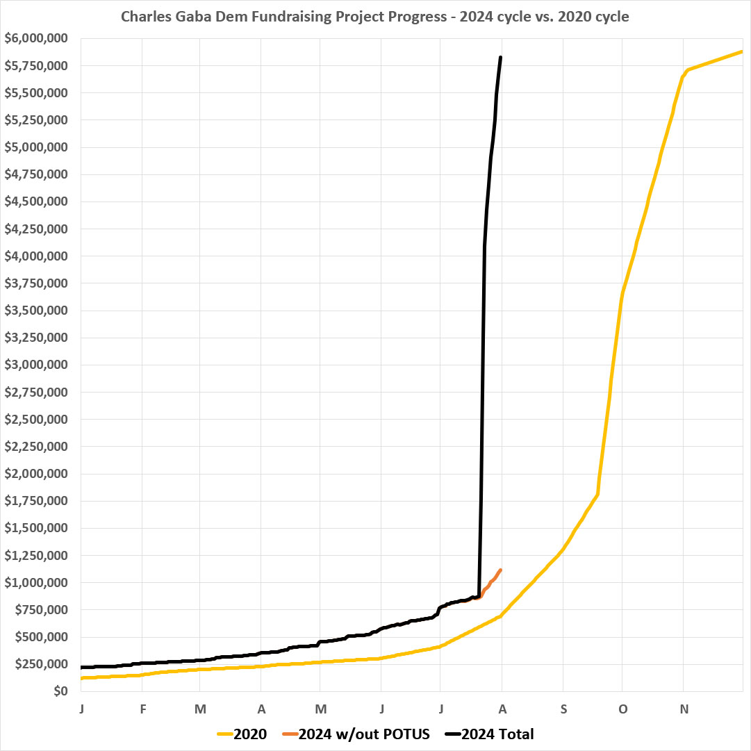 That isn't a typo. I raised $4.72 million for the Democratic Presidential Nominee in July, virtually all of it happening immediately after President Biden announced he was dropping out of the campaign and endorsing Vice President Kamala Harris.