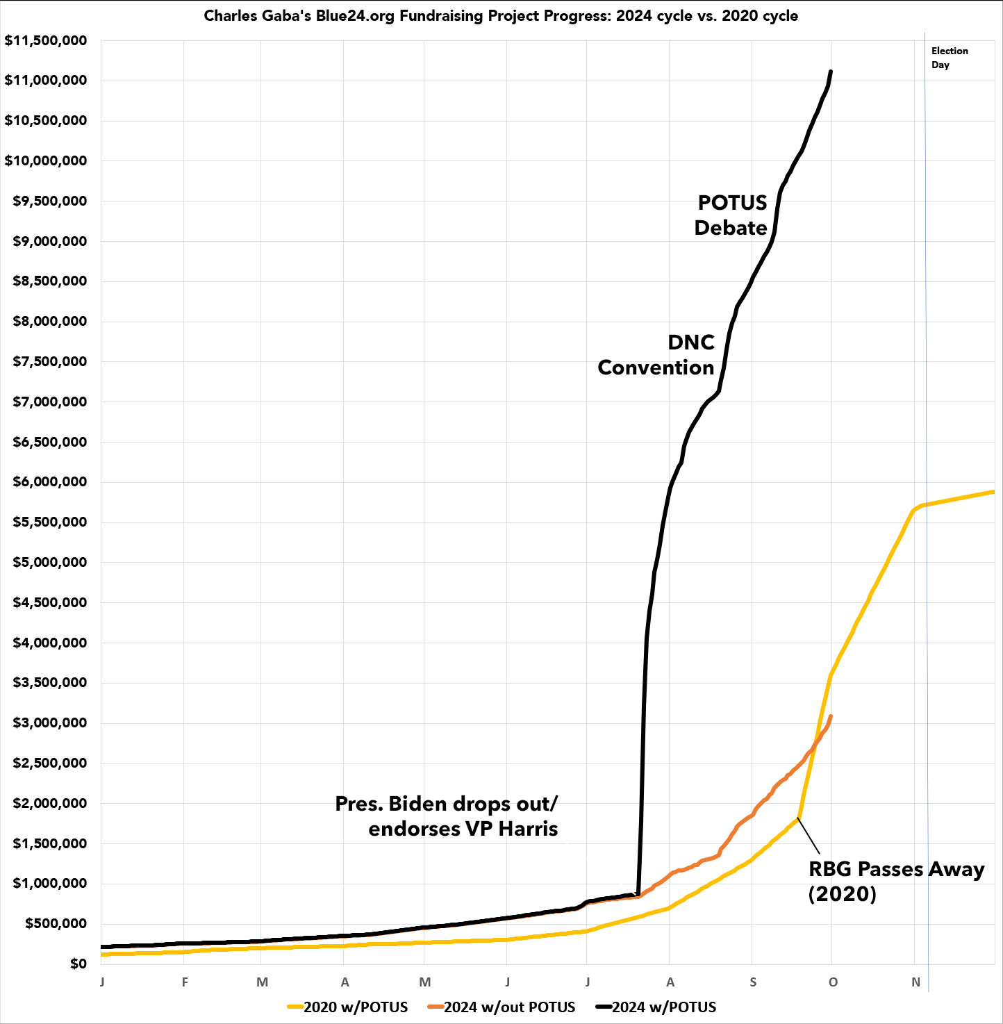 You can easily see this in the following graph which overlays my 2024 fundraising over time (with & without POTUS included) vs. 2020 over the same time period: