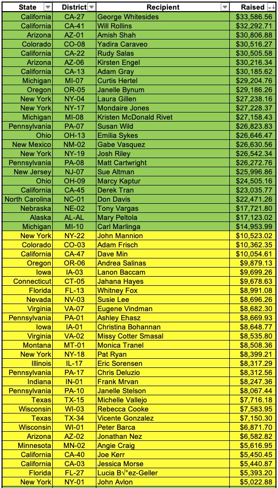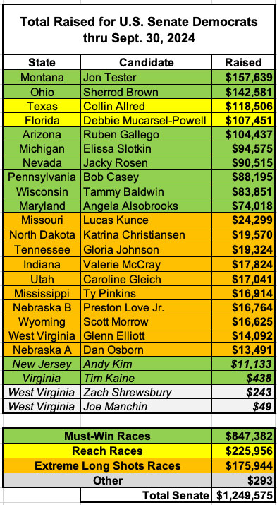 Here's the breakout of my U.S. House fundraising thru the end of September for the 52 races on my main House page (I've also raised lesser amounts ranging from as little as $1.50 to as much as $3,400 apiece for another 180 candidates but it would take too long to fill in all of their districts & states).