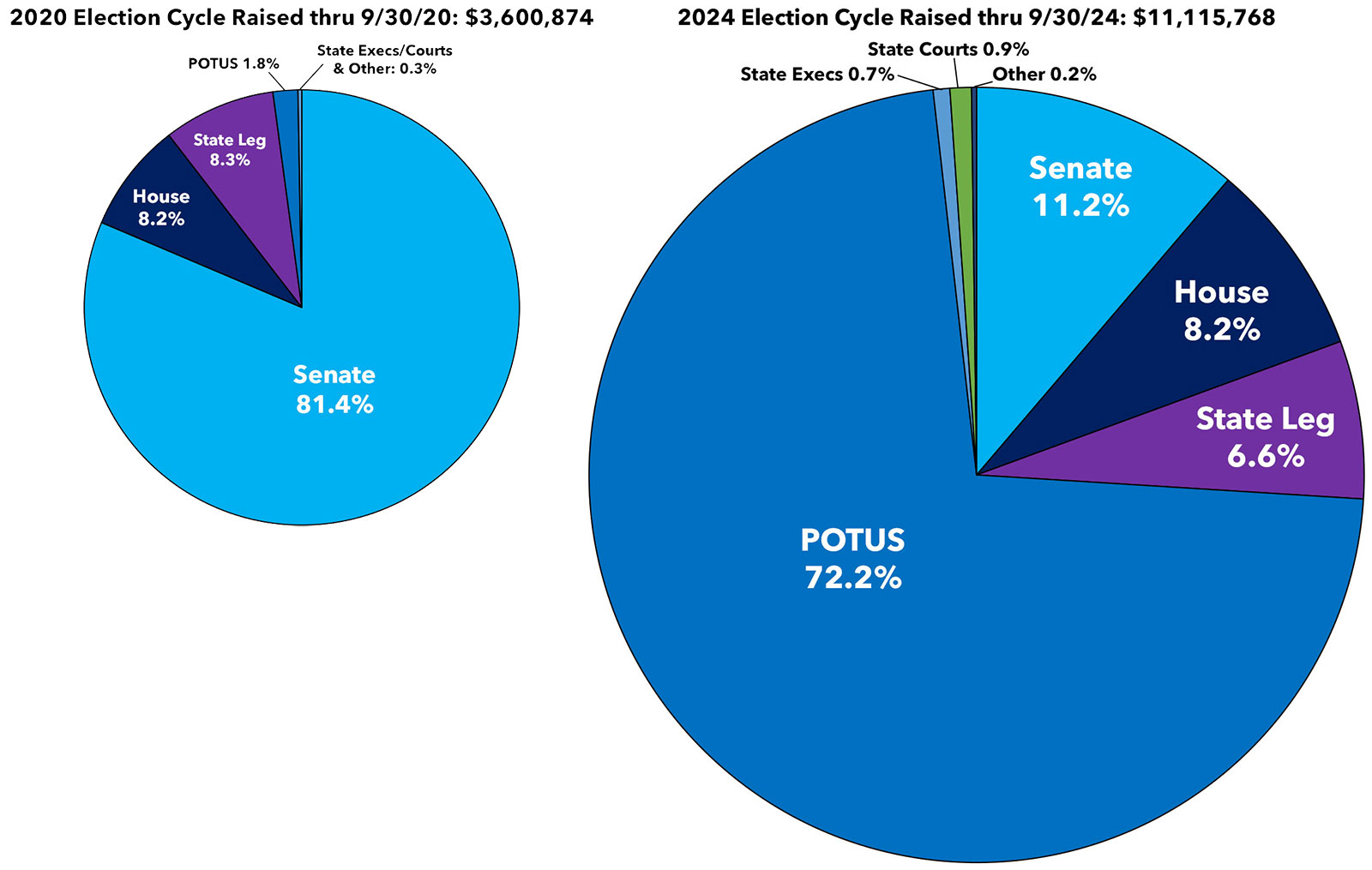 Here's what they look like side by side...scaled to reflect the massive increase in the overall size of the fundraising pie vs. four years ago: