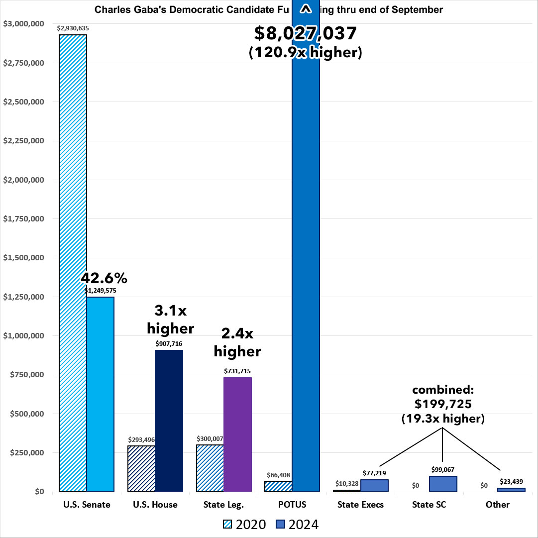 Four years ago, as of Sept. 30, 2020, I had raised a total of $3.6 million for Democrats up & down the ballot, broken out as follows;