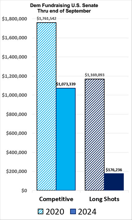 As a result, while my overall Senate fundraising is indeed down a whopping 57% from 2020, for competitive races it's only down 39% (the long shot races are down 85%):