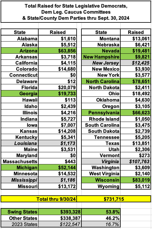 Here's the breakout of what I've raised for State Legislative Democrats, including the State Democratic Parties & Democratic legislative caucus PACs whose sole purpose is to elect state legislative Democrats.