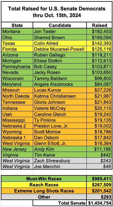 Here's how much I've raised to date for each U.S. Senate candidate. As you can see, the Tier 1 races are well ahead of the Tier 2 ones, with the exception of the two which I removed some time ago (Kim & Kaine).