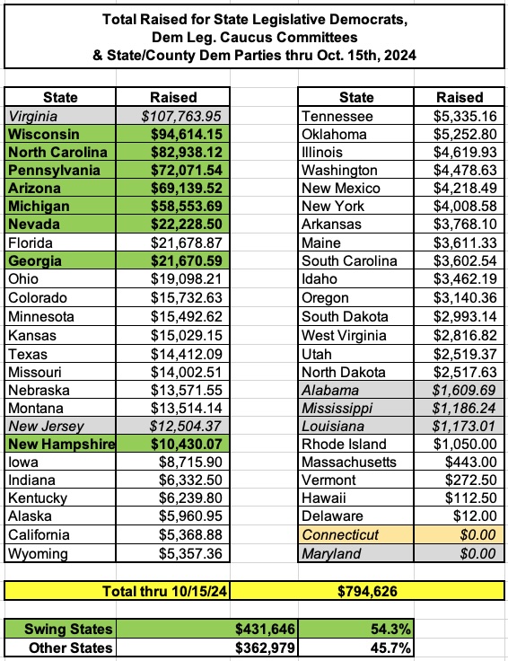 Here's the breakout of what I've raised for State Legislative Democrats, including the State Democratic Parties & Democratic legislative caucus PACs whose sole purpose is to elect state legislative Democrats.