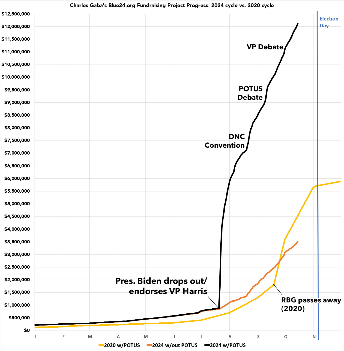 You can easily see this in the following graph which overlays my 2024 fundraising over time (with & without POTUS included) vs. 2020 over the same time period: