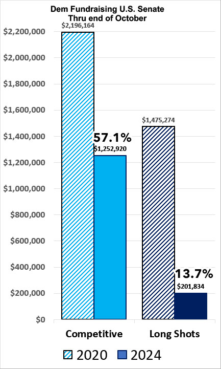 As a result, while my overall Senate fundraising is indeed down a whopping 60% from 2020, for competitive races it's only down 43% (the long shot races are down 86%):