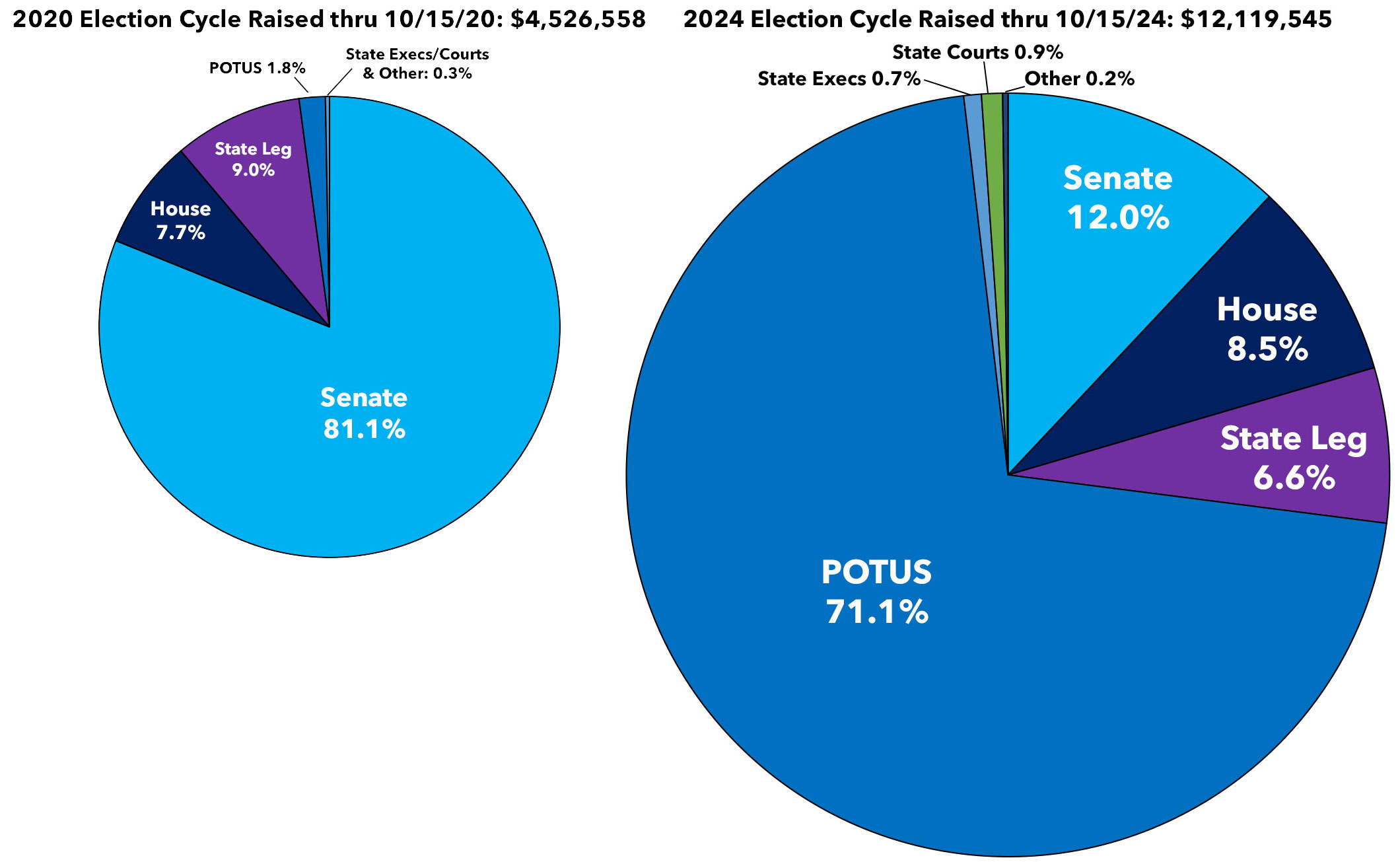 Thru September 30, 2020, Senate donations were split 60/40 between the Competitive and Long Shot Senate races.
