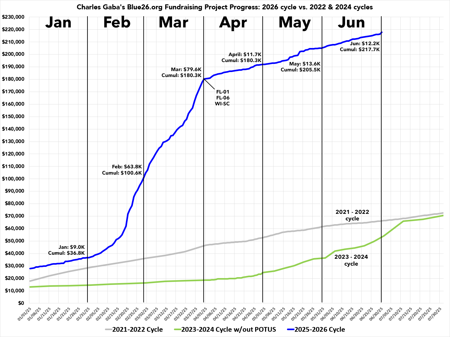 In spite of the pace dropping off dramatically now that the high-profile special elections in Florida & Wisconsin are behind us, I still raised 2.7x as much in June alone than I did in May 2021.