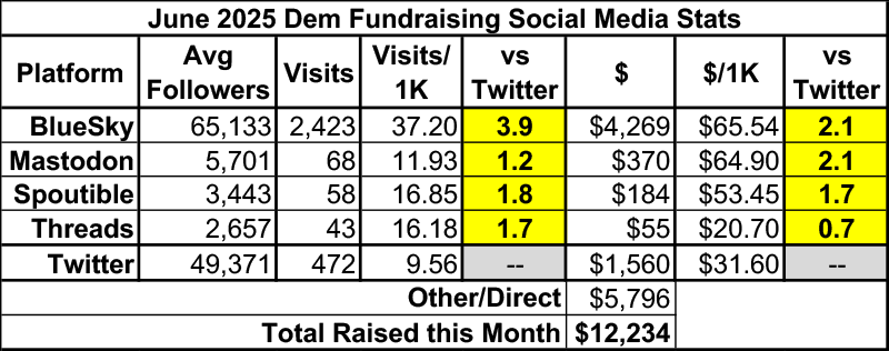 As for social media engagement, as you can see, on a per-follower basis, every other platform continues to kick Twitter/X's ass, with BlueSky generating 3.9x as many clickthrus per post and 2.1x as much in donations per follower.