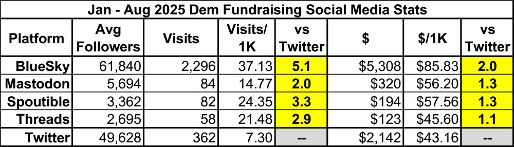 As for social media engagement, August was something of an anomaly: While Bluesky once again kicked Twitter's ass in engagement (3.6x as many link clicks per follower), it was only slightly ahead in terms of actual donations (1.2x as much as Twitter per follower):